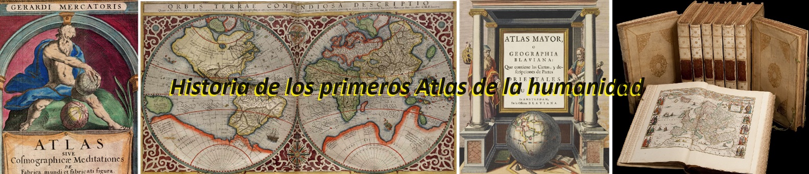 Derecha: Portada y Planisferio del "Atlas sive Cosmographicae meditationes de fabrica mvndi et fabricati figura" de Gerardus Mercator, año 1595. Izquierda: Portada y Volúmenes del "Atlas Mayor" concebido por Willem Blaeu y compilado por su hijo Johan Blaeu, año 1670