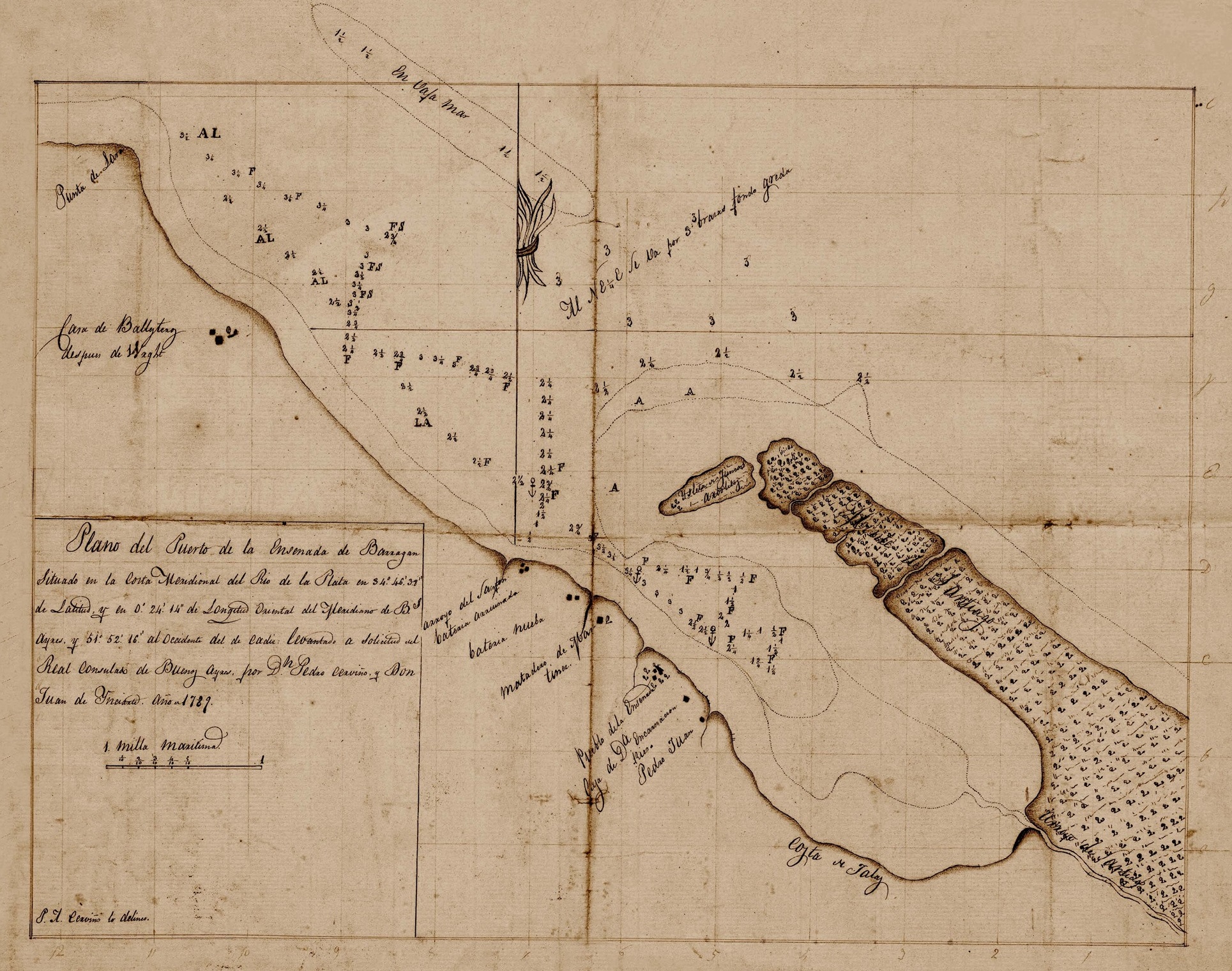 Plano del Puerto de la Ensenada de Barragán, levantado a solicitud del Real Consulado de Buenos Aires, por Don Pedro Cerviño y Don Juan de Ynciarte año de 1789. Fuente: Archivo General de la Nación