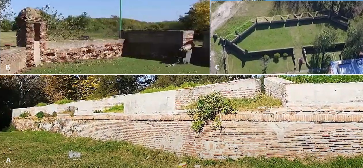 Ruinas del Fuerte Barragán. A) Muro externo que daba al rio, B) Patio interno, C) vista aerea