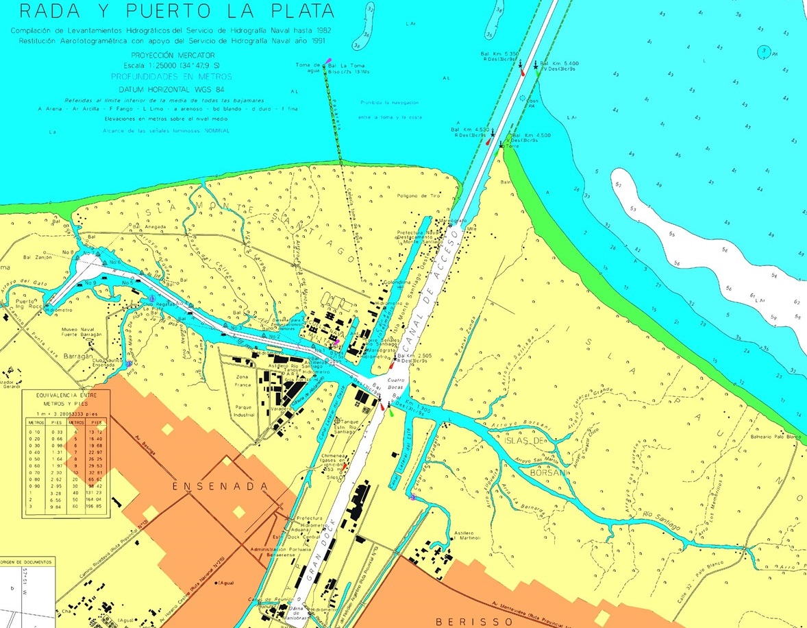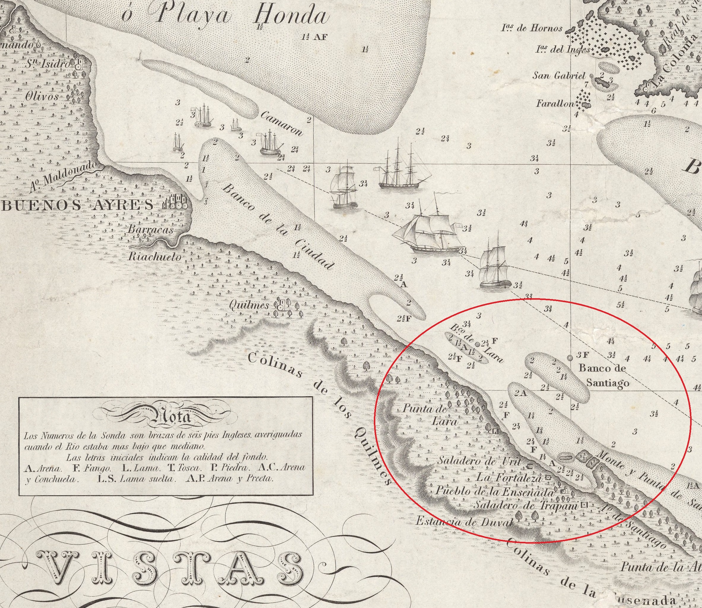 Detalle en "Carta esférica del Rio de la Plata" de Andres de Oyarvide de 1812. Donde según nota de referencia: "Los números de la Zonda son Brazas de 6 Pies Inglesas averiguadas cuando el rio estaba mas abajo que mediano". Si una Braza equivale a 1,8288 metros entonces donde el zondeo indicada 21/4 (en la entrada a la ensenada) la profundidad sería de 4 metros.