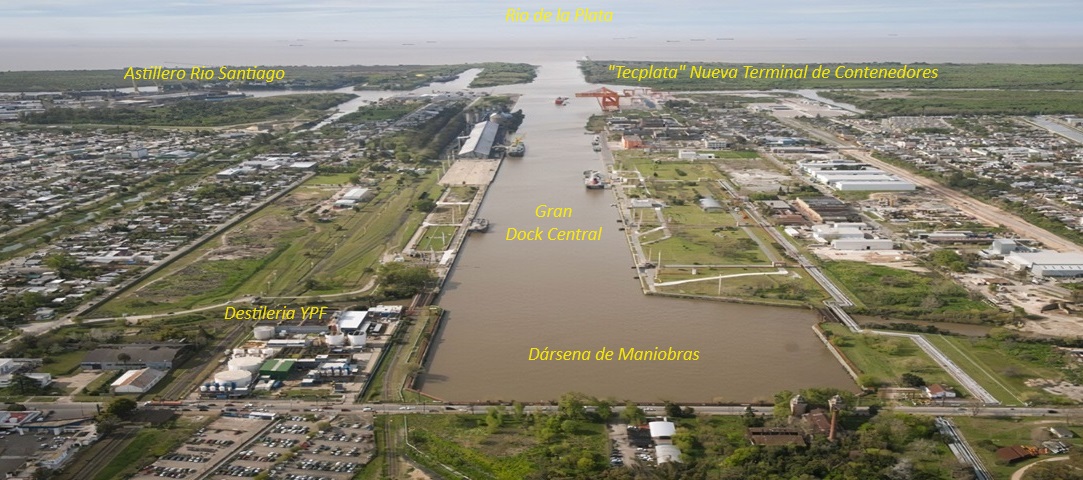 "Tecplata" en el Puerto de La Plata, que fuera licitada en 2008. La infraestructura incluye muelle, 13 grúas de última generación, y 25 hectáreas de patio de estiba de contenedores con una capacidad operativa inicial de 450,000 TEUs por año, con posibilidad de ampliación a 900,000 TEUs por año.