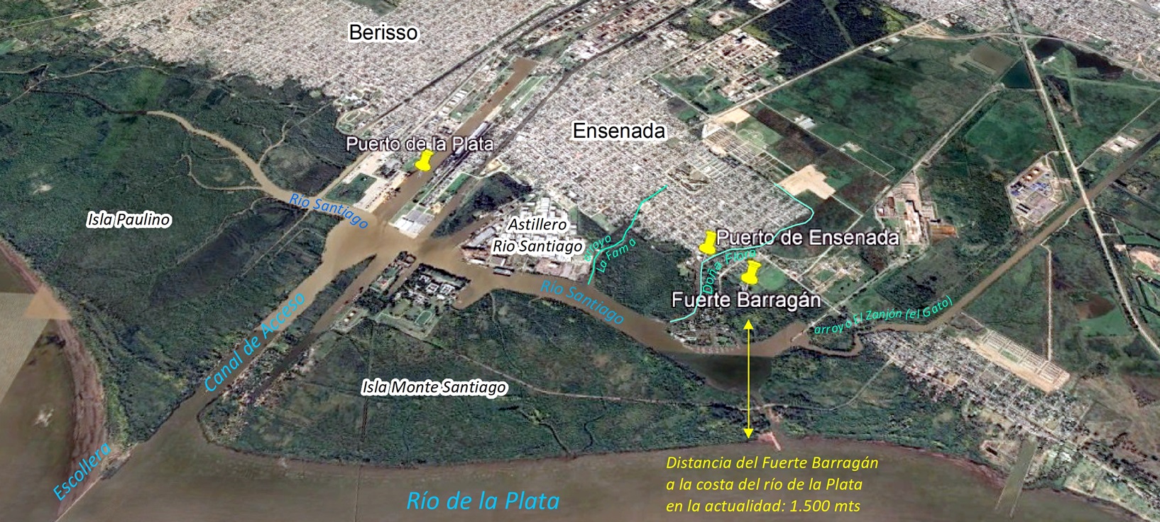 Ruinas del Fuerte Barragán (hoy museo), Antiguo Puerto de Ensenada en la desembocadura del arroyo Doña Flora (proximidades del Club Náutico Ensenada) y Puerto de la Plata vistos desde el rio de la Plata. Imagen 2024.