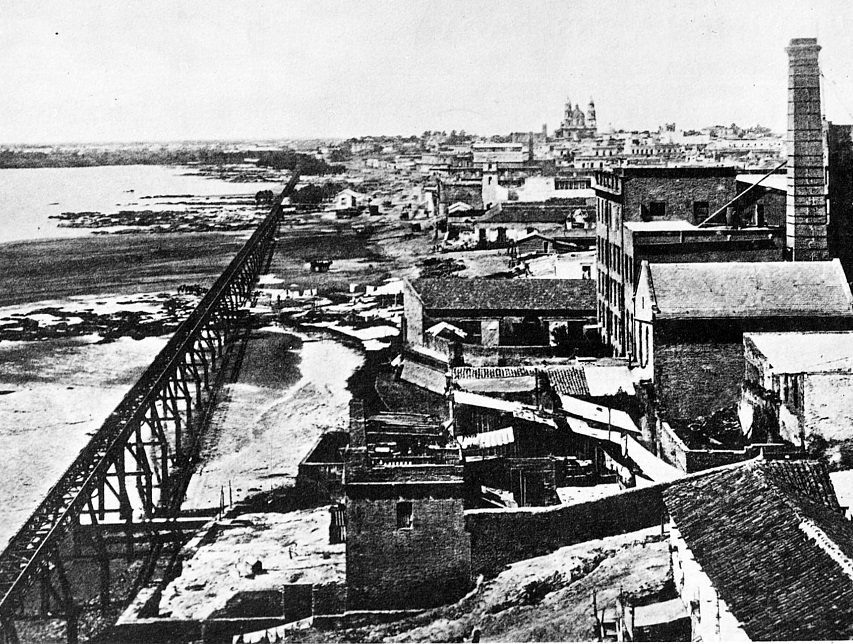 Viaducto metálico del "Ferrocarril Buenos Aires al Puerto de Ensenada" erigido en la costa del Río de la Plata, sobre la traza de la actual Avenida Paseo Colón.