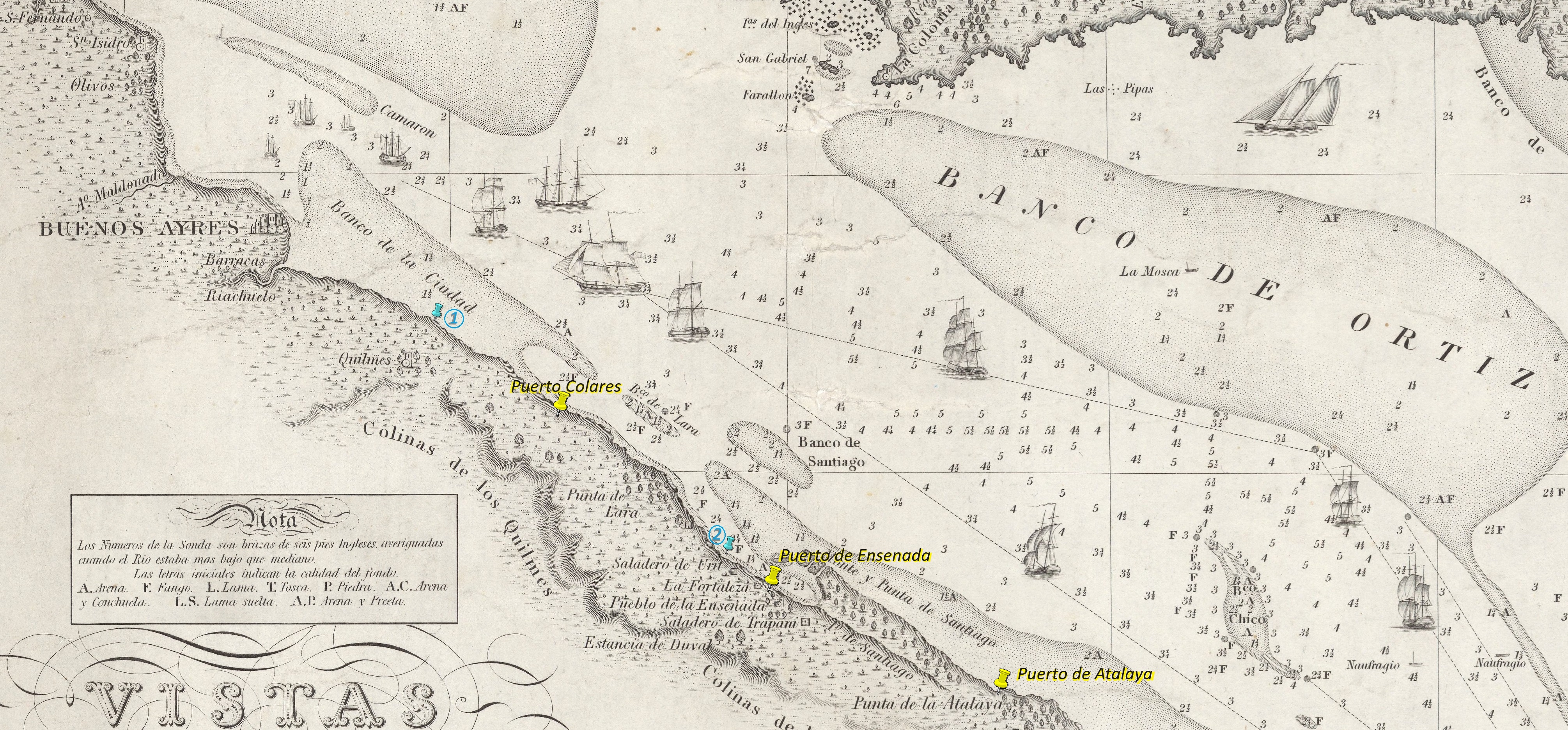 Detalle en "Carta esférica del Rio de la Plata" de Andres de Oyarvide de 1812. Donde según nota de referencia: "Los números de la Zonda son Brazas de 6 Pies Inglesas averiguadas cuando el rio estaba mas abajo que mediano". Si una Braza equivale a 1,8288 metros entonces donde el zondeo indicada 21/2 (en la rada frente en la boca del puerto) la profundidad sería de 4,5 metros.