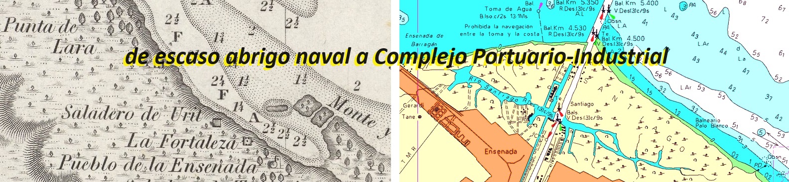 Derecha: Detalle de la Ensenada de Barragán en "Carta esférica del Rio de la Plata" de Andres de Oyarvide de 1812. Izquierda: Detalle en la carta náutica "H118 Rio de la Plata Superior" del servicio de Hidrografía naval del 2020
