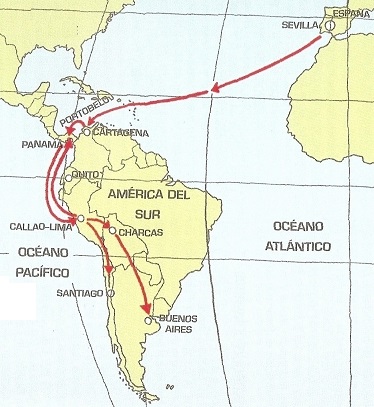 Para la corona española, toda la riqueza generada por el cerro de Potosí en el Alto Perú (hoy República de Bolivia) sólo podía salir por el puerto del Callao en Lima, hacia el puerto de "Panamá" en el pacifico, luego transportadas por tierra a través del istmo para ser reembarcadas en "Portobelo" y desembocar en Sevilla. Asegurando los beneficios a los comerciantes de esas ciudades, tributarios de importantes “comisiones” a la corona. Para ello estableció formalmente un sistema de galeones.