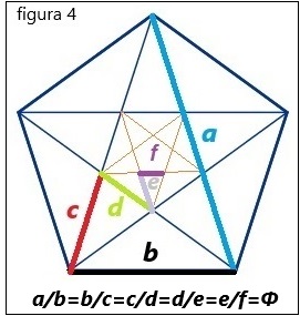 La sorprendente característica de esta sucesión de pentagonos y pentagramas, es que si se mira a los segmentos en línea en orden de longitud decreciente (figura 4) como a, b, c, d, e, f, todo segmento es menor que el anterior por un factor precisamente igual a la Proporción Áurea, Φ.