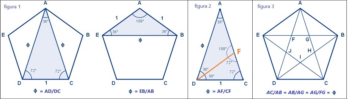 Si bisecamos uno de los dos ángulos de la base de 72º (como en la figura 2), obtenemos un triángulo menor DCF con los mismos ángulos (36-72-72) que el mayor ADC. Donde el punto F divide la línea AC precisamente en Proporción Áurea. En otras palabras, en un pentágono regular la proporción de la diagonal al lado es igual a Φ.