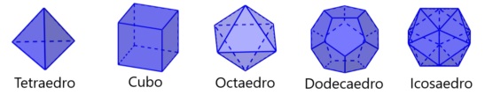 Los cinco sólidos platónicos se distinguen por las siguientes propiedades: son los únicos sólidos en los que todas sus caras (de un sólido dado) son idénticas y equiláteras; además, cada uno de los sólidos puede inscribirse en una esfera (tocando la esfera todos sus vértices). Los sólidos platónicos son el tetraedro (con cuatro caras triangulares), el cubo (con seis caras cuadradas), el octaedro (con ocho caras triangulares), el dodecaedro (con doce caras pentagonales), y el icosaedro (con veinte caras triangulares).