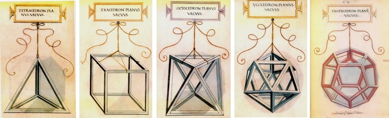 Dibujos de Leonardo da Vinci de los poliedros regulares vacíos (tetraedro, hexaedro, octaedro, icosaedro y dodecaedro) que ilustran la obra de Luca Pacioli "La Divina Proporción" (Venecia,1509)