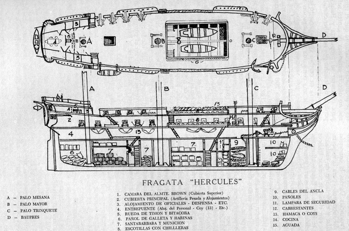 - La fragata mercante Hércules, de construcción rusa, entró en Buenos Aires el 22 de diciembre de 1813 procedente de Liverpool al mando del capitán William Coffin. Fue ofrecida en venta y adquirida a cuenta del estado por Juan Larrea y Pío White. Se incorporó a la escuadra el 4 de enero de 1814 y se convirtió en nave insignia del teniente coronel de marina Guillermo Brown el 1 de marzo de 1814. Portaba 350 toneladas, tenía 38 m de eslora, 6 de manga y un calado de 2,25 m. Montaba cuatro cañones de 24; ocho cañones de 18; 12 cañones de 6 (en el armamento de los buques de la época, el tamaño de los cañones se indicaba en función del peso del proyectil expresado en libras) y 6 pedreros —en total 30 piezas— y era tripulada por ciento veinte marineros y reclutas y sesenta soldados.