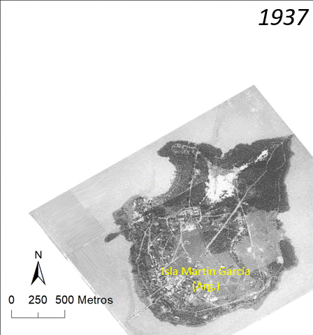 Las imágenes de la Isla Martín García, a través de los años, muestran el crecimiento aluvional del banco Timoteo Domínguez hasta dar forma a la isla y también la modificación por acción del hombre.