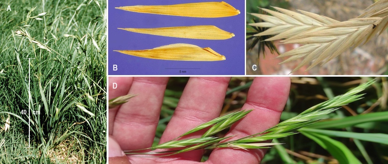 A) Vista completa B) Semillas, primer plano C) Espiguillas de flores maduras de color pajizo, primer plano D) Tamaño de la espiga.